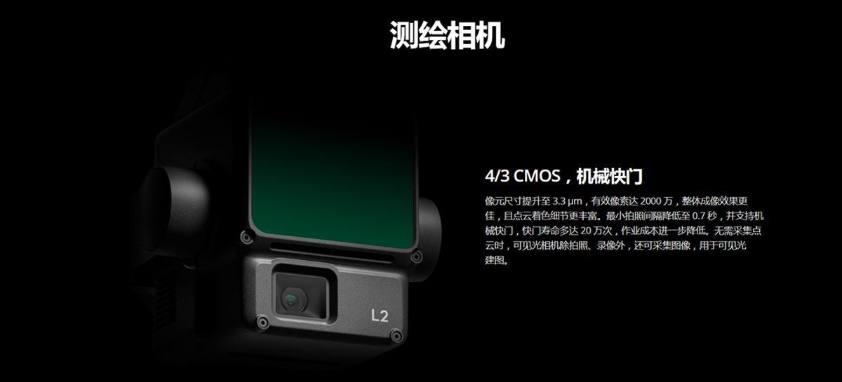 机载高精度测绘激光雷达禅思 L2 集成框幅式激光雷达、高精度自研位姿系统和 4/3 CMOS 可见光测绘相机,赋予 DJI 飞行平台更精准、高效、可靠的三维数据采集能力,配合大疆智图,即可构建三维数据获取和高精度后处理一体化解决方案。